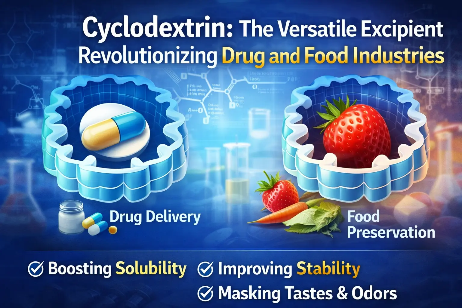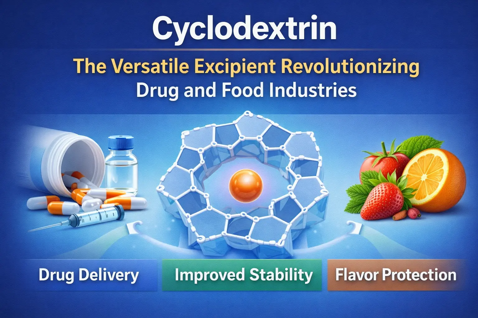 Penemuan siklodekstrin adalah salah satu langkah paling penting ke hadapan dalam sejarah makanan dan perubatan. Oligosakarida kitaran semula jadi ini telah mengubah cara kami menghantar ubat, memastikan makanan segar dan menggunakan banyak bahan kimia lain dalam industri. Pruduct membuat kompleks kemasukan yang menangani masalah penting dalam banyak bidang berkat struktur molekulnya yang tersendiri, yang mempunyai rongga dalam hidrofobik dan permukaan luar hidrofilik. Eksipien fleksibel ini mengubah sains formulasi dan proses pembuatan di seluruh dunia. Ia boleh melakukan segala-galanya daripada meningkatkan penyerapan dadah kepada menyembunyikan rasa buruk dalam ubat-ubatan.