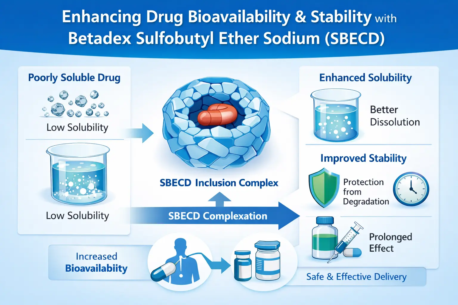 Betadex Sulfobutyl Ether Sodium (SBECD) mengubah cara ubat dibuat dengan menggabungkan dengan ubat yang tidak larut dengan baik. Derivatif siklodekstrin ini meningkatkan bioavailabiliti dengan membungkus molekul, yang menjadikan sesetengah bahan kimia larut sehingga 1000 kali lebih baik dalam air. Peningkatan kestabilan berlaku kerana SBECD mengekalkan molekul ubat daripada rosak sambil mengekalkan keberkesanan rawatannya. Sebagai eksipien yang diluluskan oleh FDA, SBECD memungkinkan untuk mentadbir ubat melalui mulut, yang tidak mungkin dilakukan sebelum ini. Ini benar terutamanya untuk ubat antikulat, antivirus, dan onkologi.